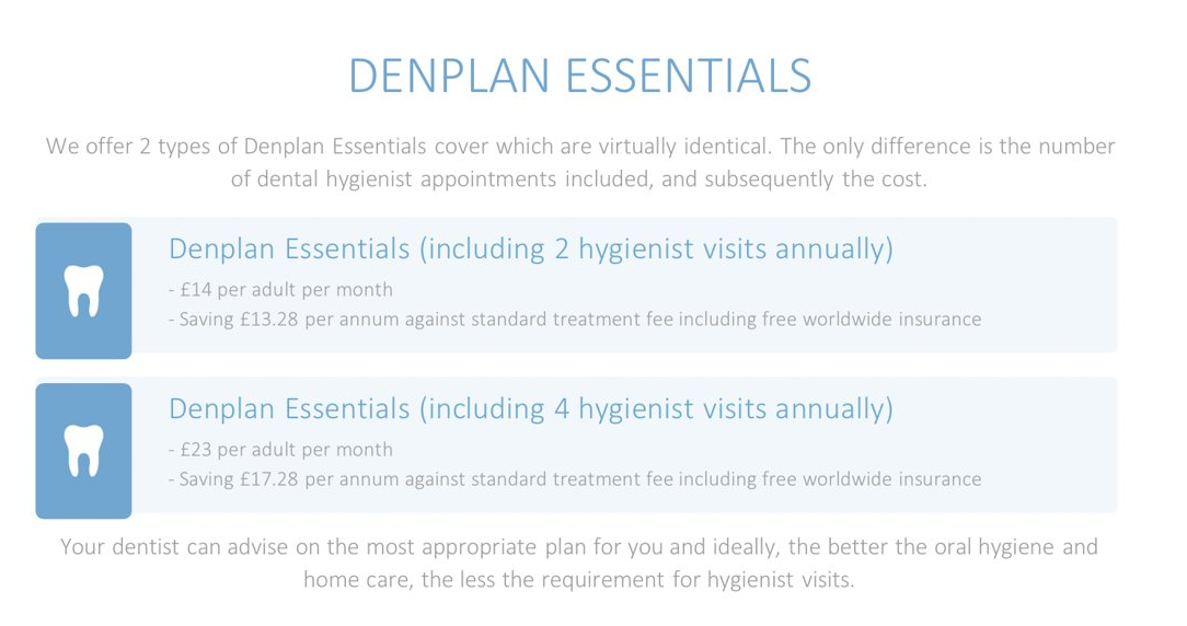 We are happy to provide a Denplan Essentials plan to our patients. As the name suggests this covers all treatment which is deemed essential for dental health and includes :